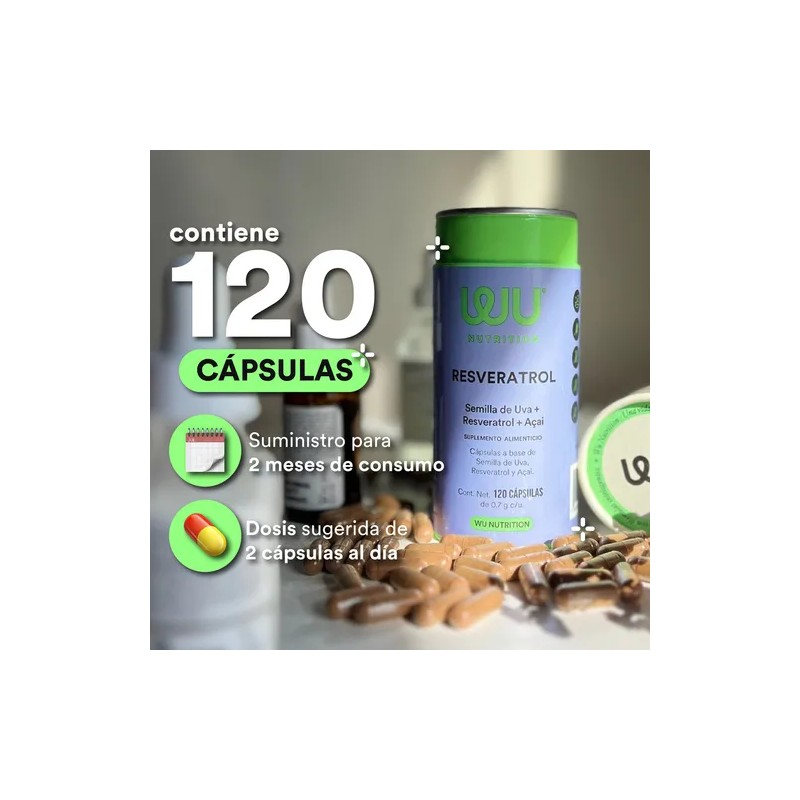 Título: Suplemento Resveratrol Wu Nutrition 120 Cápsulas Antioxidante Semilla de Uva Acaí Bienestar 2 Meses De Consumo Alimenticio