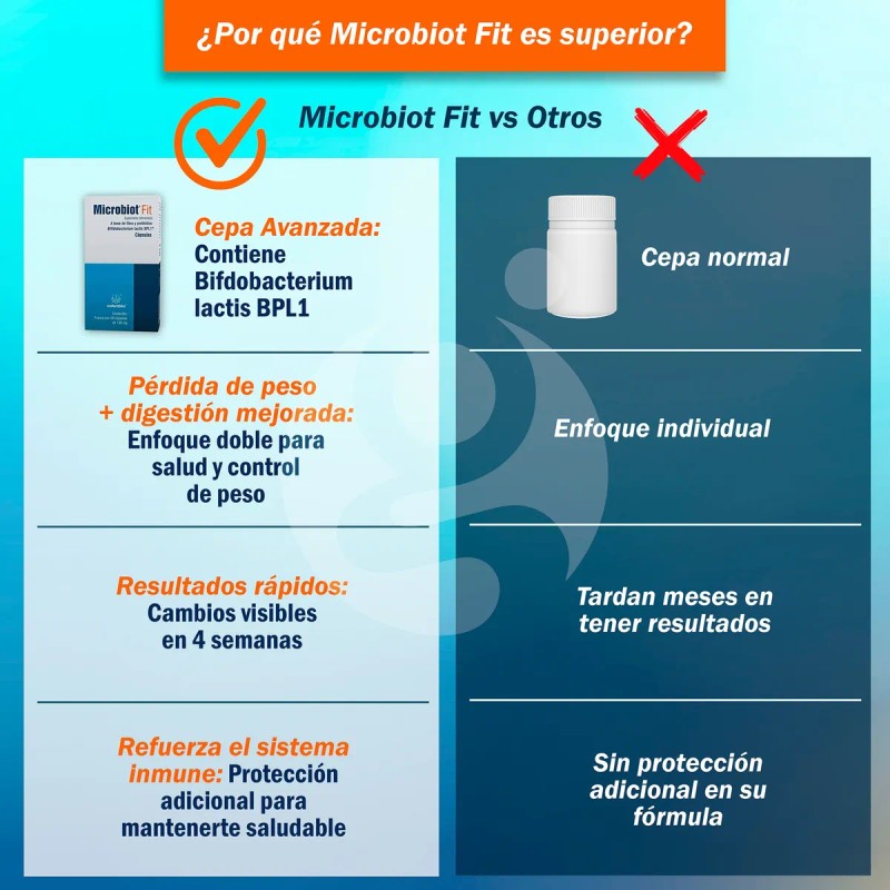 Microbiot Fit es un suplemento alimenticio que contiene 10 billones de probióticos Bifidobacterium lactis BPL1, una cepa probiótica especialmente seleccionada por sus beneficios para la salud intestinal. Esta fórmula está diseñada para mantener un equilibrio intestinal saludable, lo cual es clave para apoyar el bienestar digestivo y general.