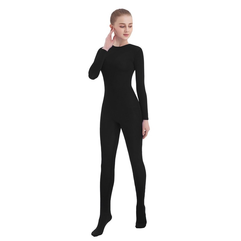 SUPRNOWA Women's Jumpsuit Bodycon Crew Neck Footed Unitard Long Sleeve Bodysuit with Zipper Comfortable Spandex One-Piece Dance Costume (M, Black Footed)