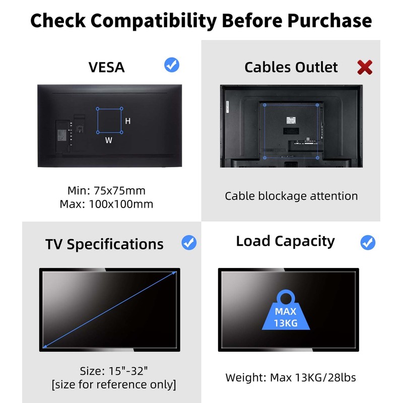 • TV Wall Mount - ideal for most 15" to 32" LED, LCD, and Plasma TVs that weigh up to 28lbs (13kg)