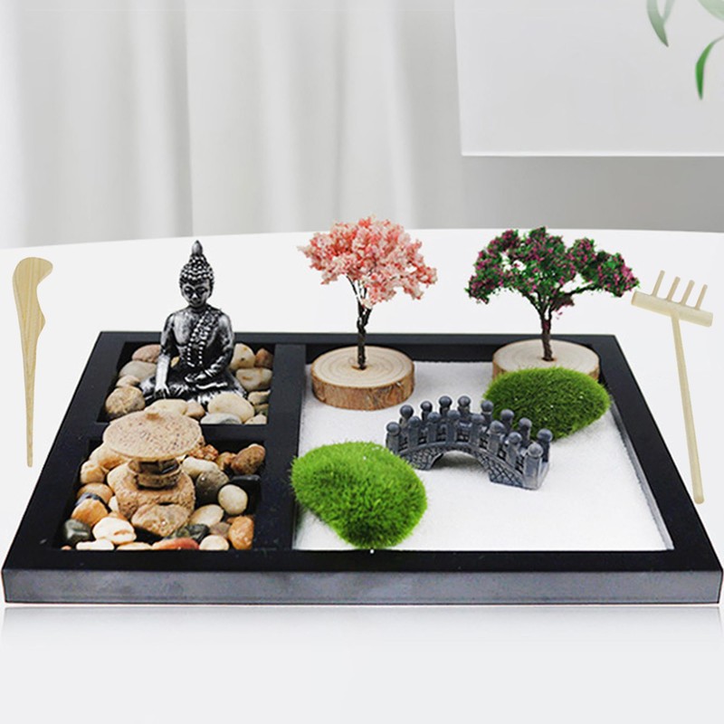 - 【Package Contents】Cherry blossom trees, zen rocks, bridge, moss stones, buddha statue, pushing sand rake.