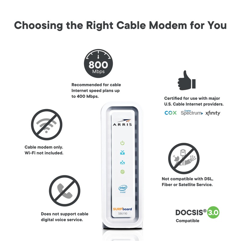 • Cable internet service required. Does not inlcude Wi-Fi and does not support cable digital voice service.