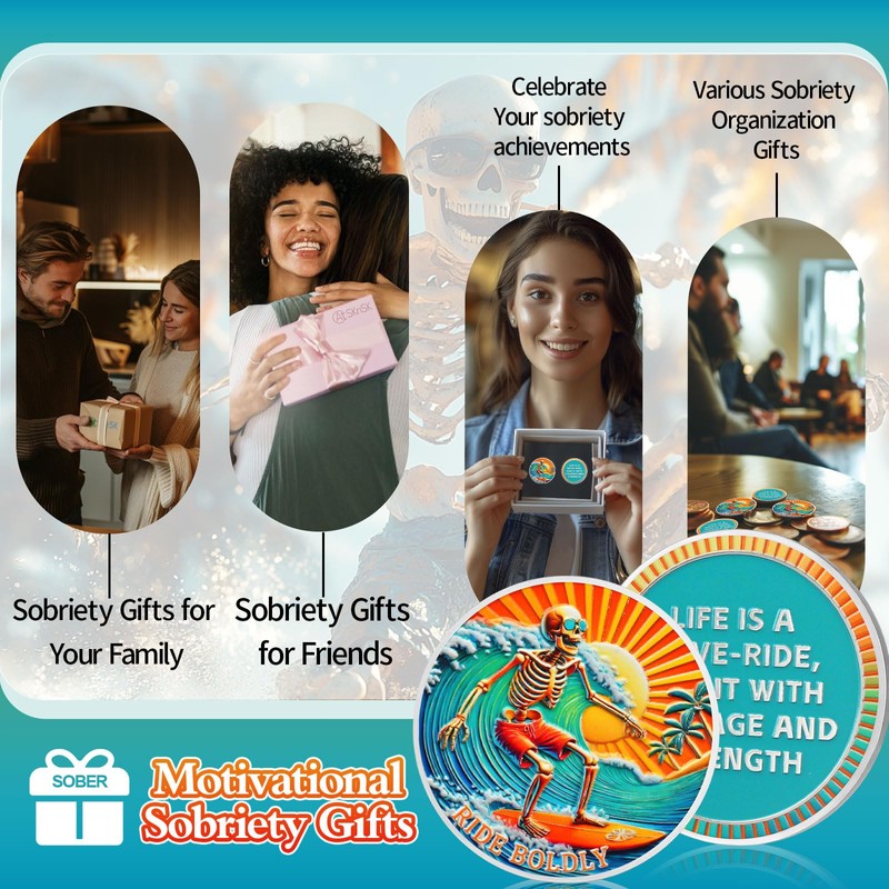 - Sober Surfing: The obverse of the Skeleton Sobriety Chip features an energetic surfing skeleton riding free on a huge wave, symbolizing maintaining courage and taking control of the direction in the midst of life's fluctuations. The sunlight and waves of the affirmation coin give a positive and free feeling, conveying the spirit of fearlessness and adventure . Sober coin's text “RIDE BOLDLY” reminds us to face everything bravely in our journey of sobriety and walk our own path with determination