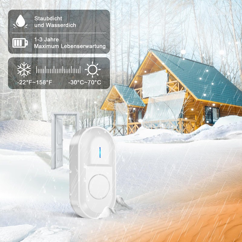 - All-weather performance: our wireless bell is dust-proof and waterproof and can withstand temperatures from -30 °C to 70 °C. It defies adverse conditions and scores with extremely low power consumption for a long battery life.