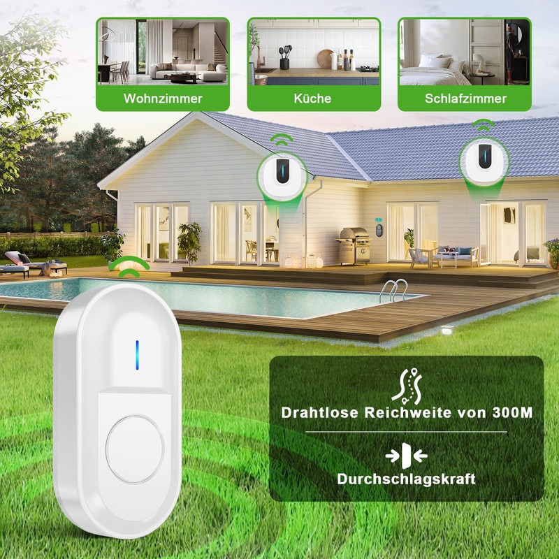 - Strong reception, anywhere: Our doorbell offers a powerful range of 300 metres in open areas so you are always accessible. Whether you are in the garden, up in the house or even in the basement, never miss a visitor again!