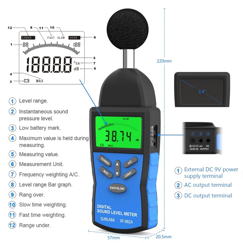 - Professional sound control tool: The Surlaba sound level meter is a professional tool designed to control ambient noise quality. It applies to noise protection, work safety, product quality control, health control, etc.