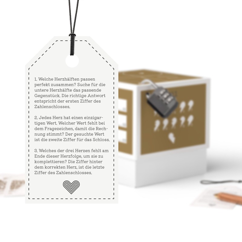 ...and literally: inside the puzzle box you can include your gift that you want to give. Whether banknotes, vouchers, experience gifts or chocolates or perfume for your girlfriend, tickets, belts, jewellery or small textile or technical gifts for your friend. However, in order for the recipient to get it, the combination lock must first be cracked, for which different things on the box have to be searched, found and knocked. Three tasks each lead to a digit of the lock. Or you can use the blank gift tag to formulate tasks yourself and easily create your personalised gift. There is also space on the bottom for your individual text and pictures. So you have everything in one: a high-quality gift packaging with surprise effect that makes every gift personal and creative. For those who love an exit game or escape boxes!