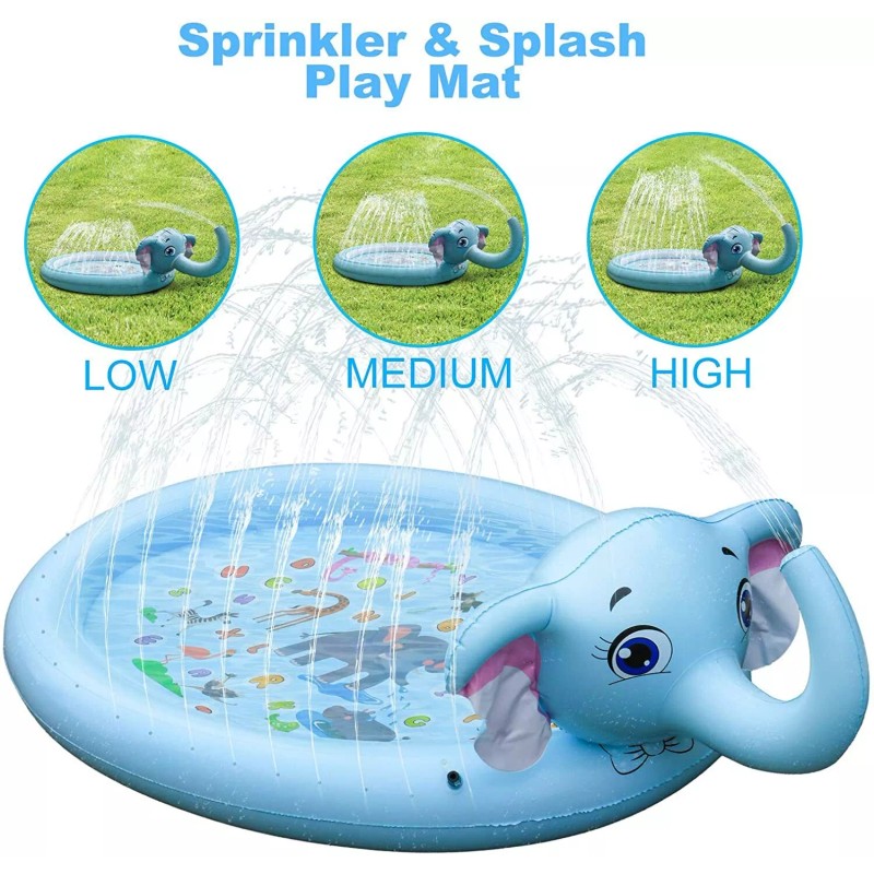 - 82" SUPER SPRINKLER PADS: 82" exclusive elephant shaped splash sprinkler pads and shallow wading pool style is for your kids to get wet, splash and make precious memories with their pets and family and friends in the hot Summer. The splash play mat allows 2-4 kiddos keep happy and cool while enjoying the outdoors.