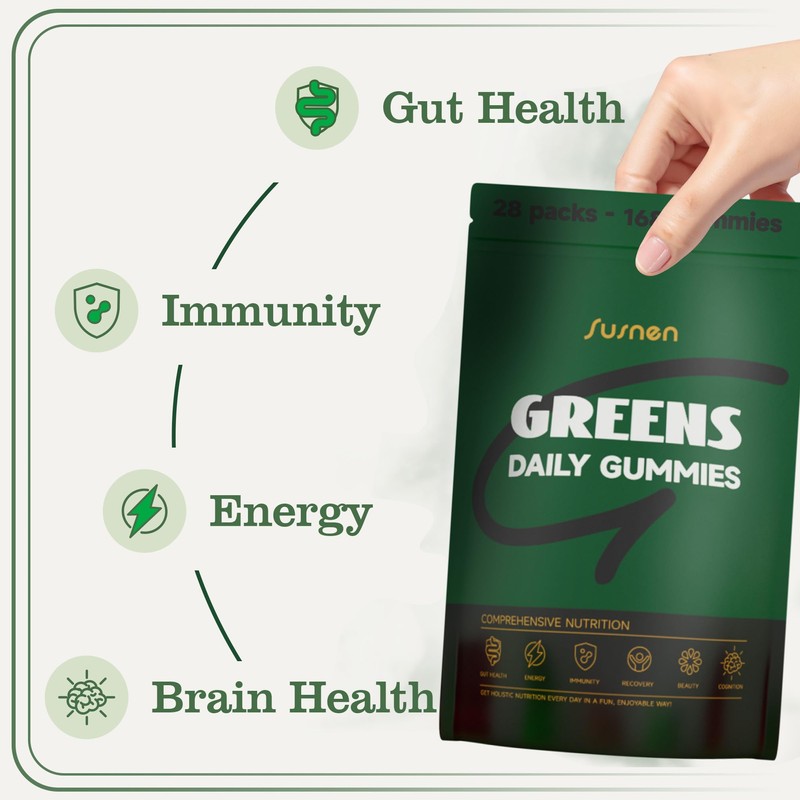 - Fuel Your Wellbeing: Susnen Greens vegetable gummies are a powerful blend of nutrient-dense super greens and superfoods, including spirulina, chlorella, parsley leaf, and kale leaf. Packed with essential vitamins like D3 and K1, these gummies provide you with a concentrated dose of greens for optimal foundational nutrition.