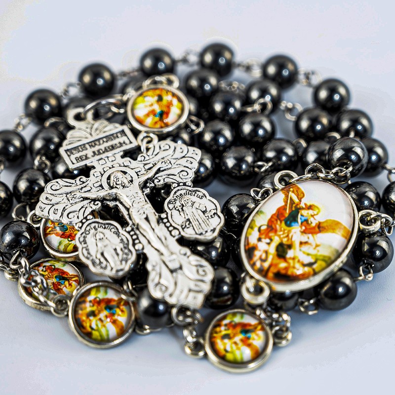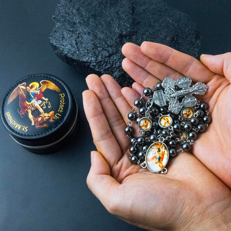 - Saint Michael Rosary: Featuring polished hematite stone beads, this rosary resists scratches and tarnish, symbolizing strength and grounding energy. The matte-black finish adds a masculine touch, ideal for men seeking a rugged yet sacred accessory for spiritual practice or daily wear