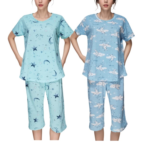 SUTPSL 2 Pack Womens Pajamas Set Cotton Short Sleeve Sleepwear Tops with Capri Pants Fun Prints Pjs(Blum+GrnS,XXXL)