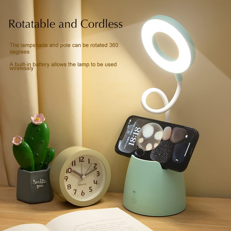 - ????Multifunktional und Leicht?? Kann nicht nur als Arbeitslampe verwendet werden, die Basis kann auch als Handyst?nder verwendet werden, sodass Sie Ihre Telefone ablegen k?nnen, w?hrend Sie Online-Kurse oder Meetings abhalten. Es kann auch verwendet werden, um kleine Gegenst?nde wie Stifte, Kabel, Kopfh?rer usw. aufzubewahren, wodurch der Platz auf dem Schreibtisch effizienter genutzt wird. Dar??ber hinaus ist es klein und kabellos, es kann ??berall hin mitgenommen werden, z. beim Camping im Freien