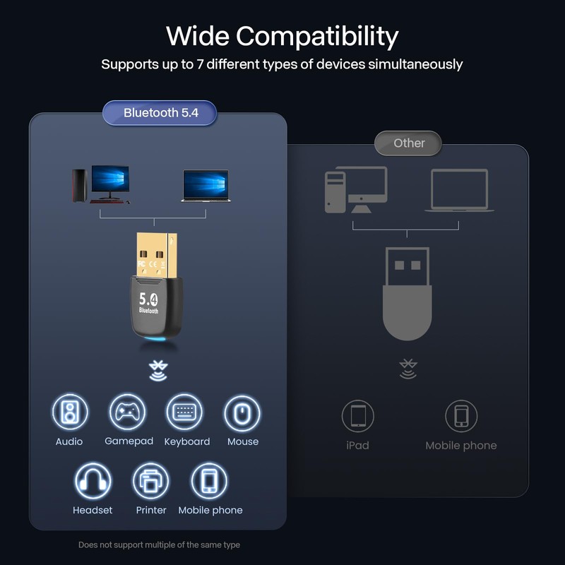 - Bluetooth 5.4 Support: Apply the latest Bluetooth 5.4 adapter,support dual-mode transmission, backward compatible with Bluetooth 2.1/3.0/4.0/5.0/5.3. To achieve anti-interference, low energy consumption, high speed and more stable transmission, rejecting delays