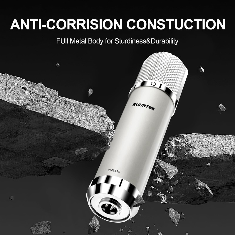 SUUNTOK FET Condenser Microphone Professional XLR Studio Microphone with 34mm Large Diaphragm, Cardioid Recording Mic Computer Gaming PC TM251S Mic Kit for Singing, Podcasting, YouTube - Gray