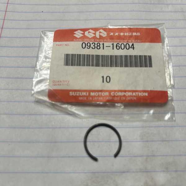 This listing is for a one brand new OEM Suzuki piston pin clip, part number 09381-16004. These clips are compatible with multiple Suzuki models, including the GSXR750, LTF250, Ozark 250 and LT230 LT-F4WD. They do not come with a warranty, but they are guaranteed to be in new and unused condition.