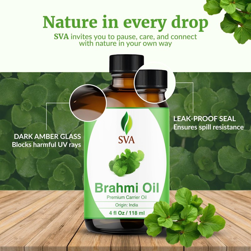 - PREMIUM THERAPEUTIC GRADE BRAHMI OIL: - SVA Organics Brahmi Carrier Oil is obtained by cold pressed extraction method of Bacopa monnieri leaves originated in India. It is 100% Pure & Natural, Authentic Carrier Oil. Our Brahmi Oil is not tested on Animals. We care for you!