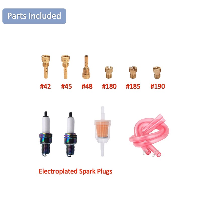 - Choke cable, 2 spark plugs, fuel filter, 3 main jets (#180 185 190), 3 pilot jets (#42 45 48).