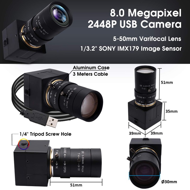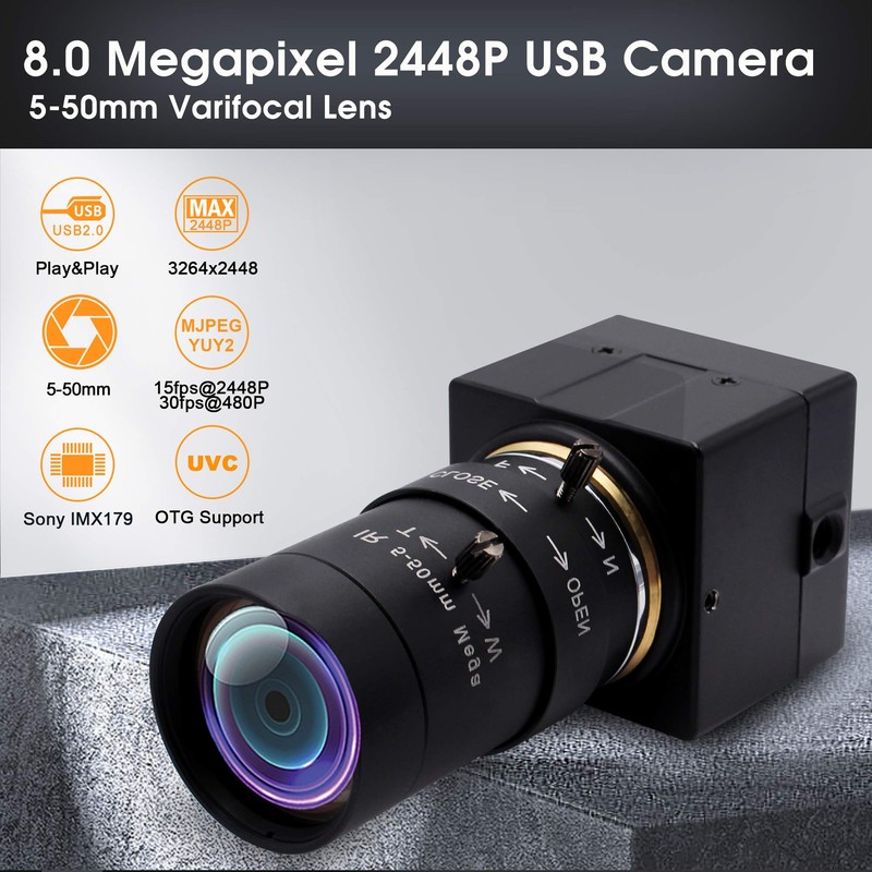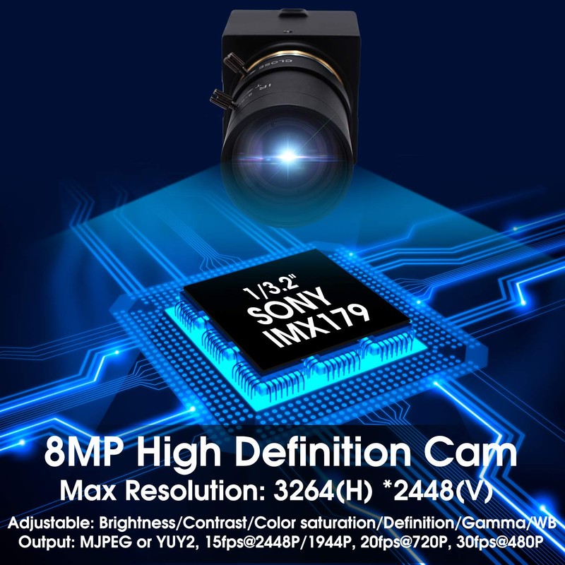 - 8MP High Definition Webcam: 8.0 megapixel USB camera with a maximum resolution of 3264 x 2448, with 1/3.2 inch Sony IMX179 and IR filter (650±10nm) for a decent image and accurate color reproduction. Supports Mjpeg and YUY2 output