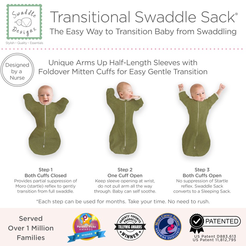 • The TRANSITIONAL SWADDLE SACK allows baby to SELF-SOOTHE and promotes BETTER SLEEP and SAFER SLEEP; Perfect for babies who prefer to sleep with ARMS UP, babies who are starting to rollover, and babies able to break out of a traditional swaddle