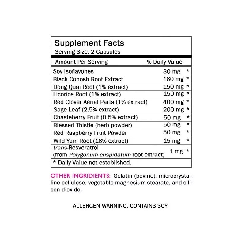 - Active Ingredients: Soy Isoflavones, Black Cohosh Root Extract, Dong Quai Root, Licorice Root, Red Clover Aerial Parts, Sage Leaf