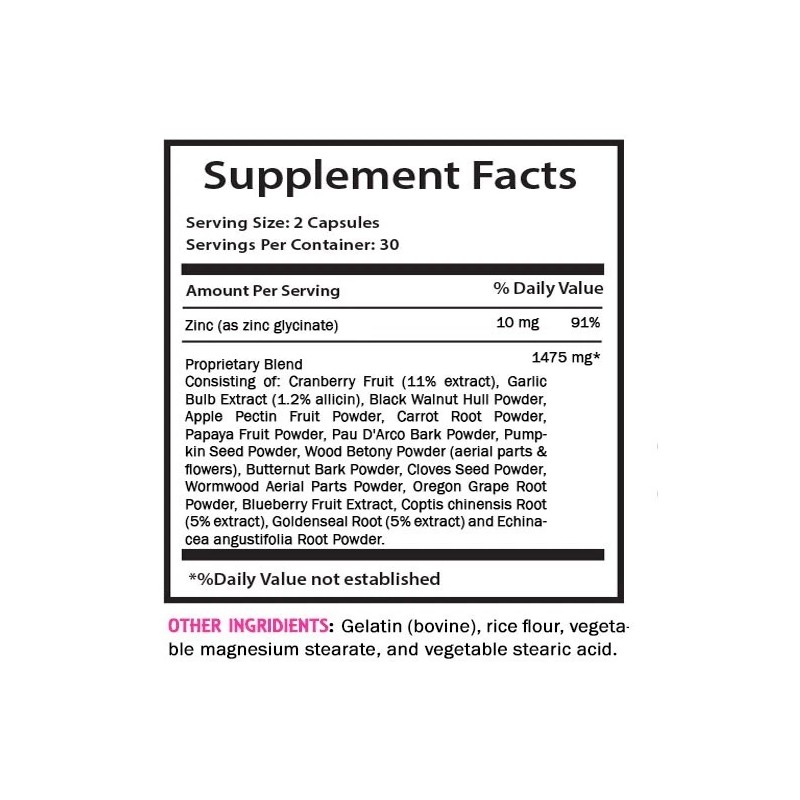- Active Ingredients: Cranberry Fruit, Garlic Bulb Extract, Black Walnut Hull Powder, Apple Pectin Fruit Powder, Cloves Seed Powder, Wormwood Aerial Parts Powder, Oregon Grape Root Powder