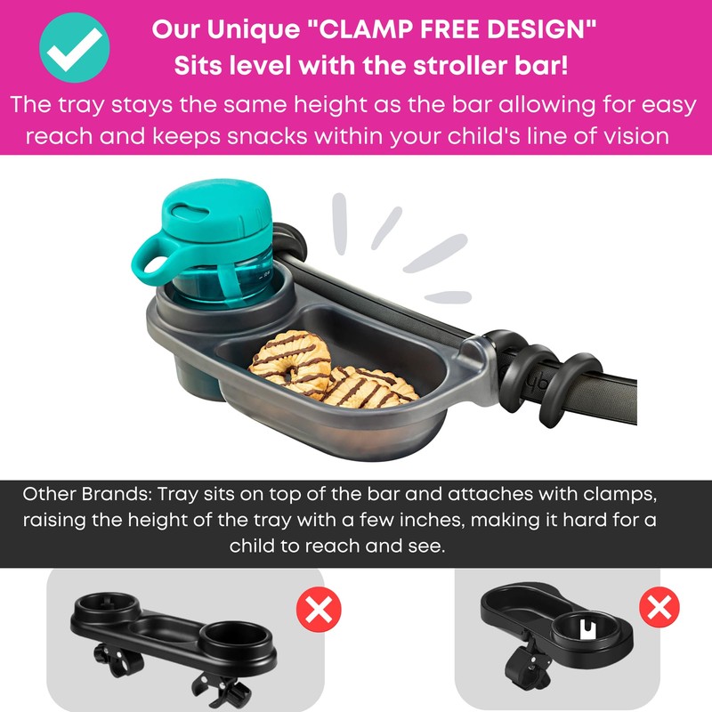 • [ SNACKING ON THE GO ] Convenietly keep you child's food and drinks handy when out and about. This universal stroller attachment was smartly designed to fit every type stroller bar weather round or straight. This snack tray for strollers is simple to attach and easy to remove.