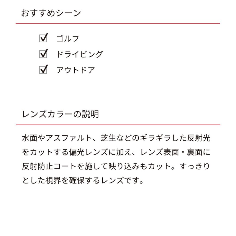 - Lens Features: Polarized (polarization: 97% or more); Reduces glare on road and water surfaces to ensure a clean view *The LCD screen may not be visible, UV Reduction: 99.99%