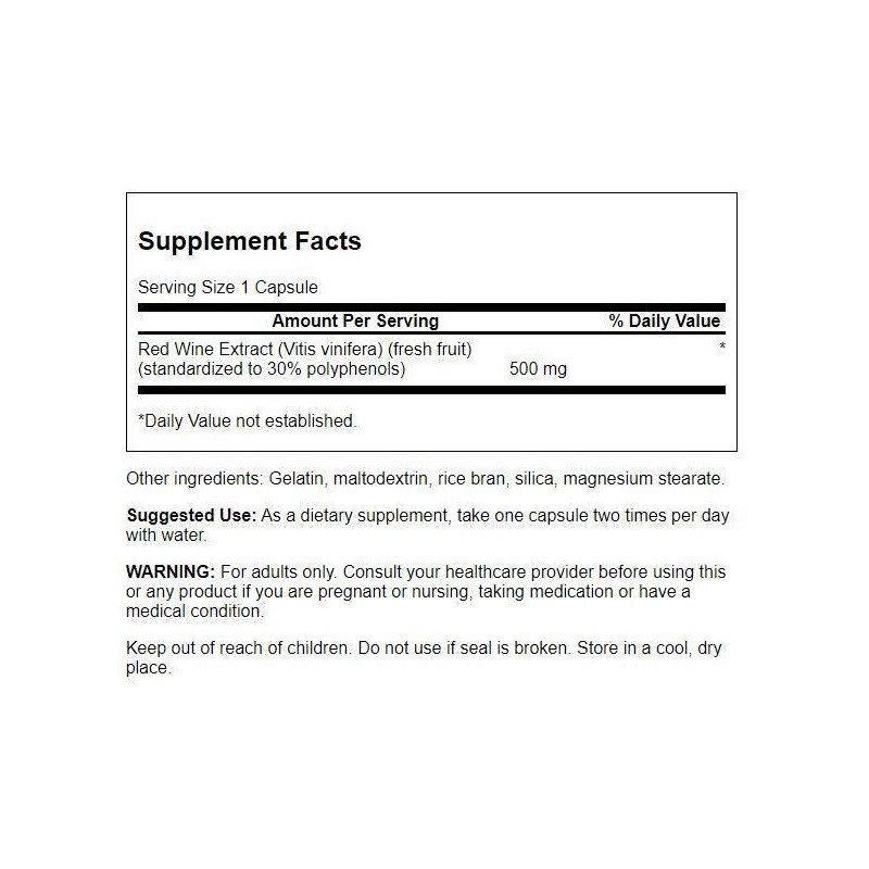 For years, nutritionists have been touting the cardiovascular and overall health benefits of red wine, and for good reason. Red wine's antioxidant polyphenol constituents display powerful free-radical protection for the cardiovascular system and the whole body. But for many people, the alcohol content of red wine has been a concern that has prevented them from taking advantage of its numerous beneficial characteristics. With our Red Wine Extract, we hope to change that so that even the most avowed teetotaler can enjoy all of the health benefits of red wine. Our Red Wine Extract gives you all the polyphenol power of red wine in a concentrated, alcohol-free form. It's standardized to an impressive 30% polyphenol concentration for guaranteed antioxidant potency in each capsule.