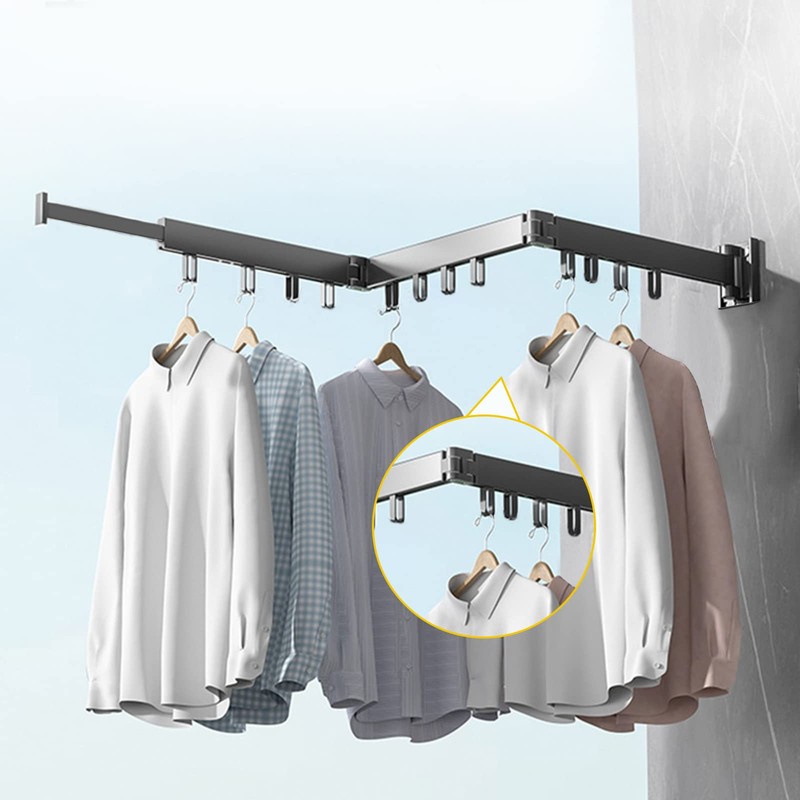 - Space-saving: The folding clothes rail can be swivelled 180° from left to right and the additional folding bar is adjustable by 360°. When idle, the hanger can be folded completely parallel to the wall to save space; when unfolded, the clothes of the family can be dried at once. The extension rod at the end of the hanger can be freely retracted and hidden.