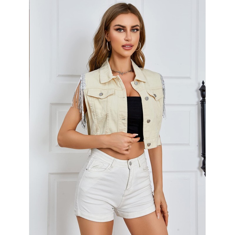 - Sleeveless, collar, tassel, button down, pockets, glitter, crop denim jacket
