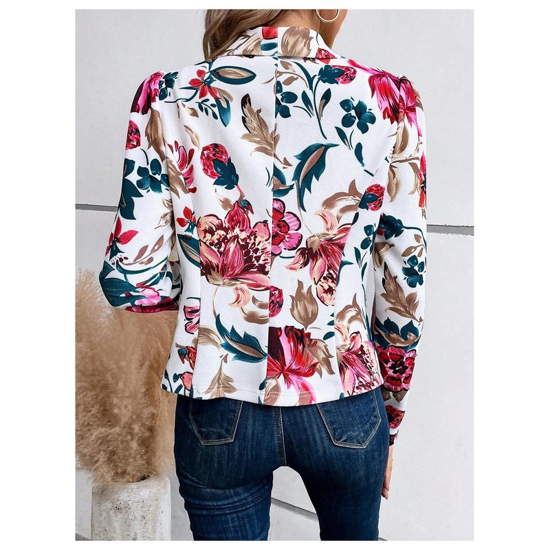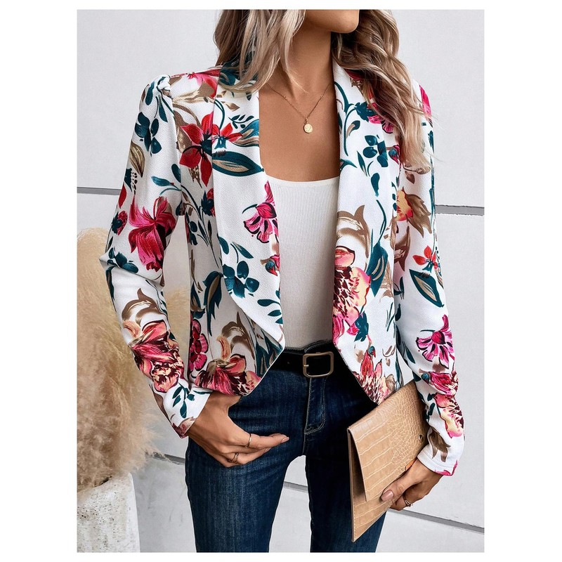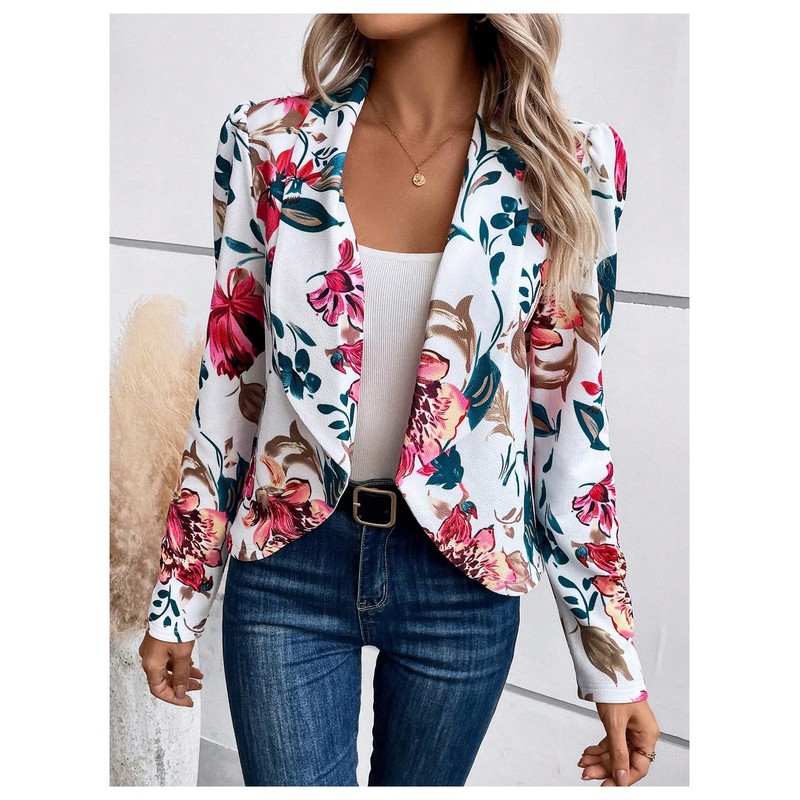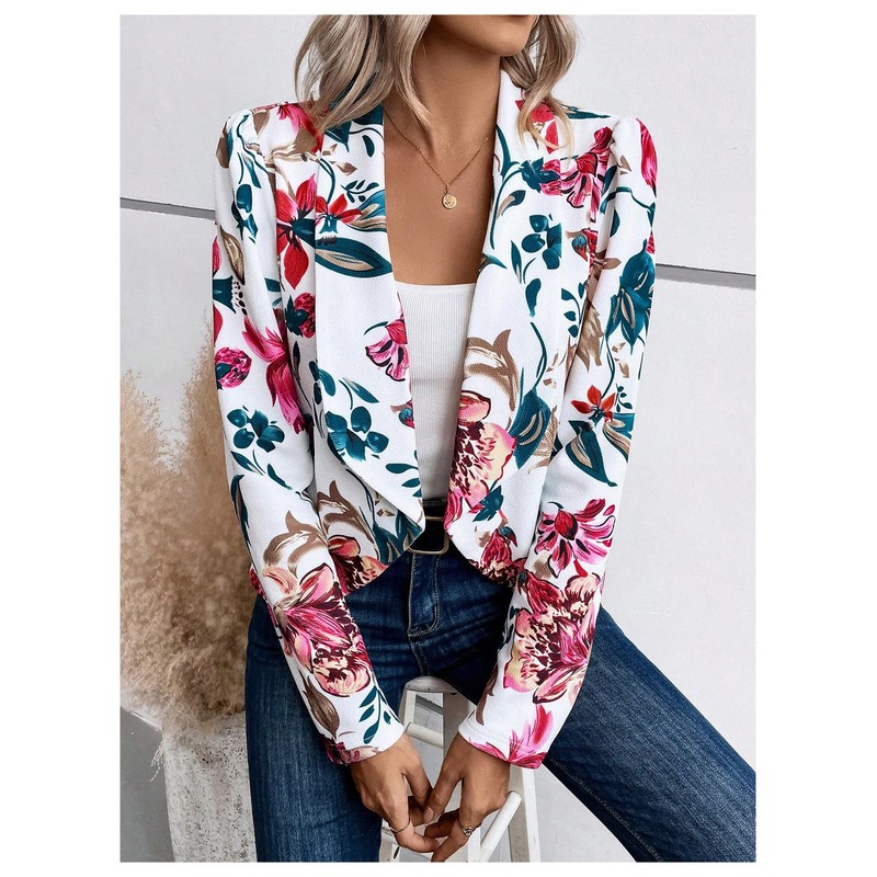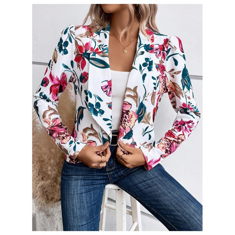 • Material: Polyester, medium stretch. Features: Floral print, open front, long sleeve, shawl collar, womens blazer