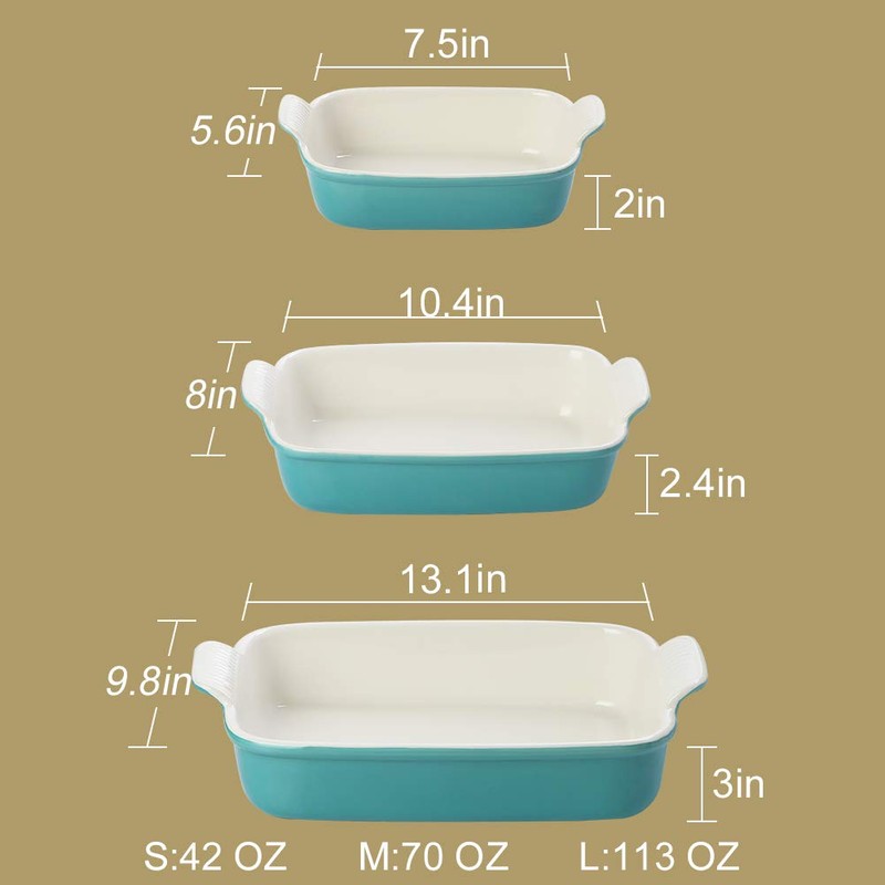 1.The SWEEJAR bakeware set includs 3 pieces bakewares of difference dimensions, suitable for lasagna, spaghetti, chicken, meat, beef, roasting, vegetables, storing and reheating leftovers and etc.