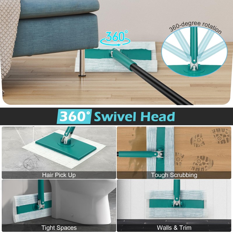 - 【Flexibled Mop Head】Flat mop head is 360-degree rotating design allows for effortless cleaning in hard-to-reach areas,including furniture gaps, corners, around table legs, baseboards, and ceilings.