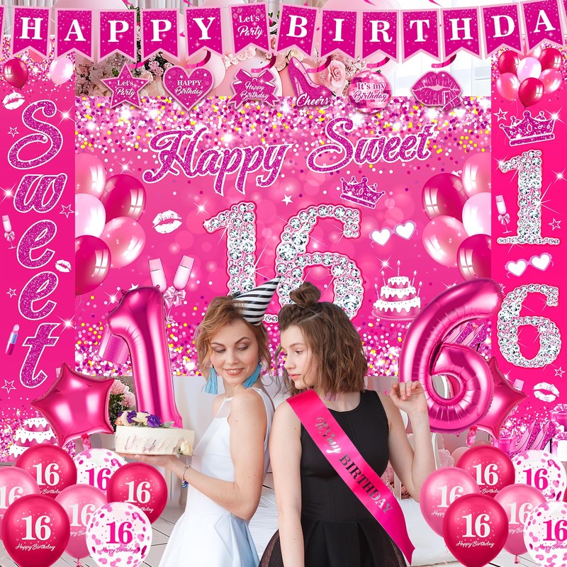 - Package Includes: The pink 16th birthday decorations for girls includes 1pc happy sweet 16 birthday banner, 1 pc hot pink happy birthday bunting banner, 2pcs sweet 16 birthday porch banner, 6pcs pink 16th birthday hanging swirls, 18pcs hot pink 16th birthday latex balloons, 2pcs star balloons, 1pc number "16" balloon and 1pc hot pink birthday sash