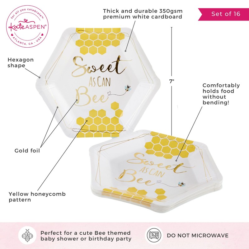 - BEAUTIFUL & FUNCTIONAL -The "Sweet as can Bee" 7 in premium paper plates are in a hexagon shape. The artwork features two gold foil hexagon borders, with honeycombs at the top and bottom and "Sweet as Can Bee" in gold foil in the center of the plate with a bee at the end of the words. These plates are packaged in shrink wrap.