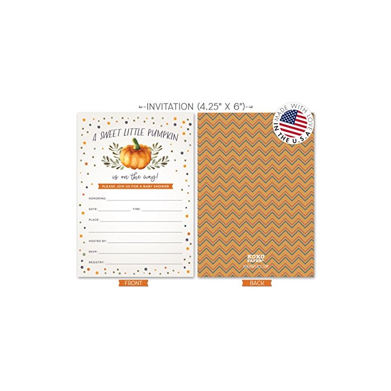 Koko Paper Co Sweet Little Pumpkin Baby Shower Invitations & Diaper Raffle Tickets – Fall Baby Shower Set – 25 Invites, Envelopes & Raffle Cards – Made in the USA