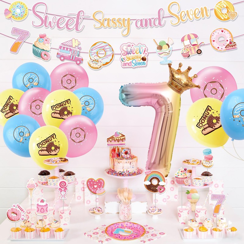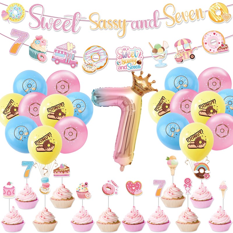- What You Will Get: A sweet sassy and seven birthday decorations set, including 2pcs donut "sweet sassy and seven" banners, 12pcs cakecup toppers and 1pc number '7' foil balloon,,18pcs donut latex balloons