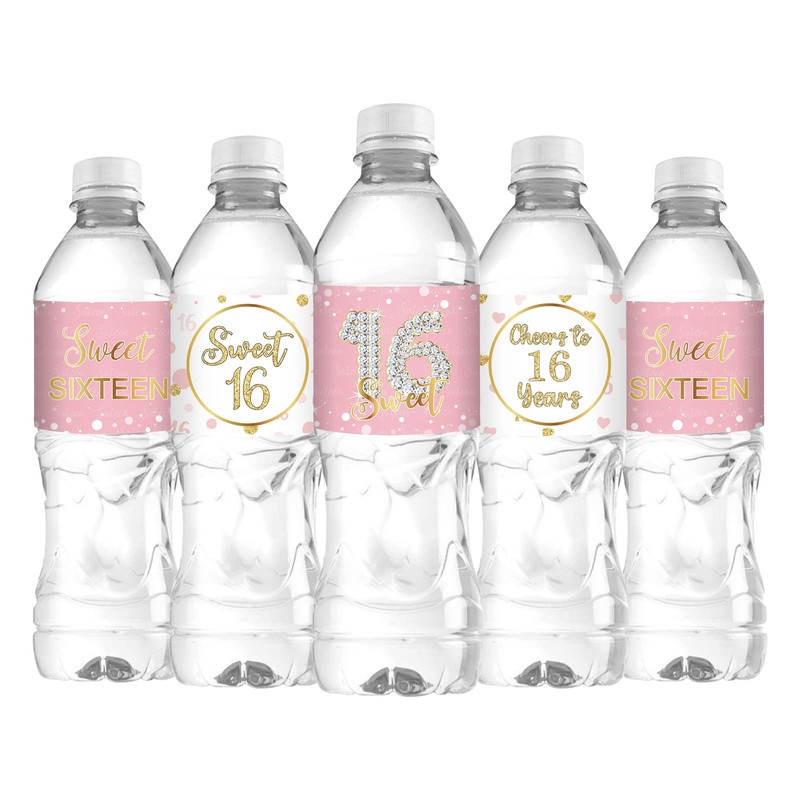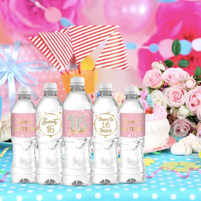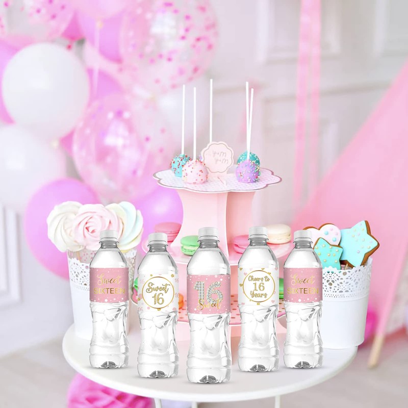 Sweet Sixteen Water Bottle Labels, Cheers to 16 Years Stickers, for Girl Happy 16th Birthday Labels Sign Pink and White - 30 Pcs