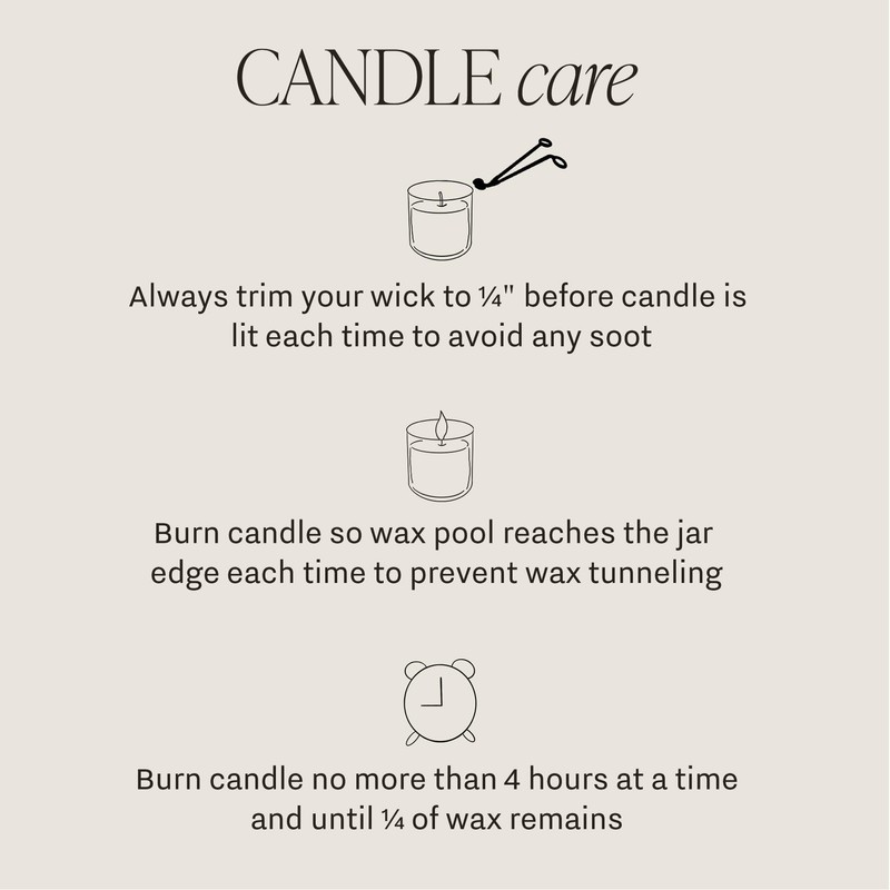 - CANDLE CARE: Trim Your Wick to 1/4" Before Candle is Lit Each Time to Prevent Soot | Burn Candle So Wax Pool Reaches the Jar Edge Each Time to Prevent Wax Tunneling | Burn Candle No More Than 4 Hours at a Time | Do Not Burn Candle with Less Than a 1/2" of Wax Remaining | Keep Candle Away From Fans, Open Windows, Hot Surfaces, Children, Pets | Never Leave a Burning Candle Unattended