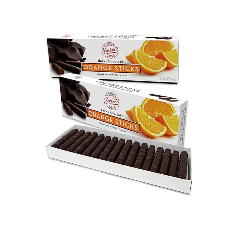 The product is a pack of 2 Sweet's Dark Orange Sticks, a gluten-free dark chocolate assortment with an orange flavor. It comes in a box packaging and has an expiration date of 2026, making it suitable for a party or as a pantry treat. The dark chocolate sticks are a delicious sweet treat perfect for those who enjoy the combination of citrus and chocolate flavors.
