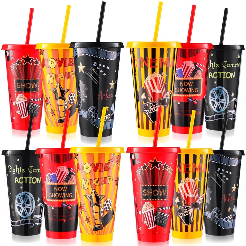 Sweetude 12 Pcs Movie Night Cups Movie Night Party Supplies Favors Movie 24oz Cups with Lid and Straw Disposable Plastic Cups for Movie Party Decorations Birthday Party Favors