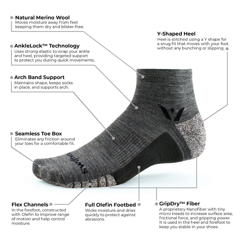 Swiftwick FLITE XT TRAIL features AnkleLock Technology that supports your ankles during quick movements on uneven & varying terrains, while GripDry Fiber in the heel and forefoot keeps your feet from sliding in your shoes.
