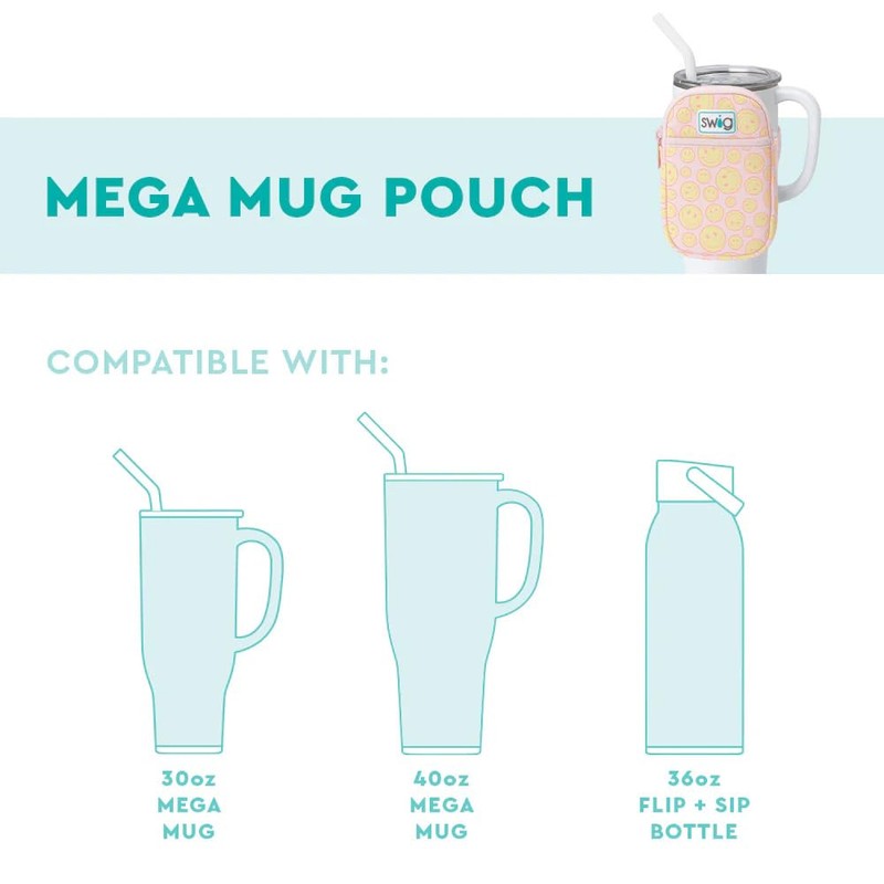 - MEGA MUG POUCH features an adjustable velcro non slip band, making it compatible with most handled tumblers, mugs, and water bottles 3.5-4" in diameter. Ideal for travel, hiking, or as your perfect gym phone holder.