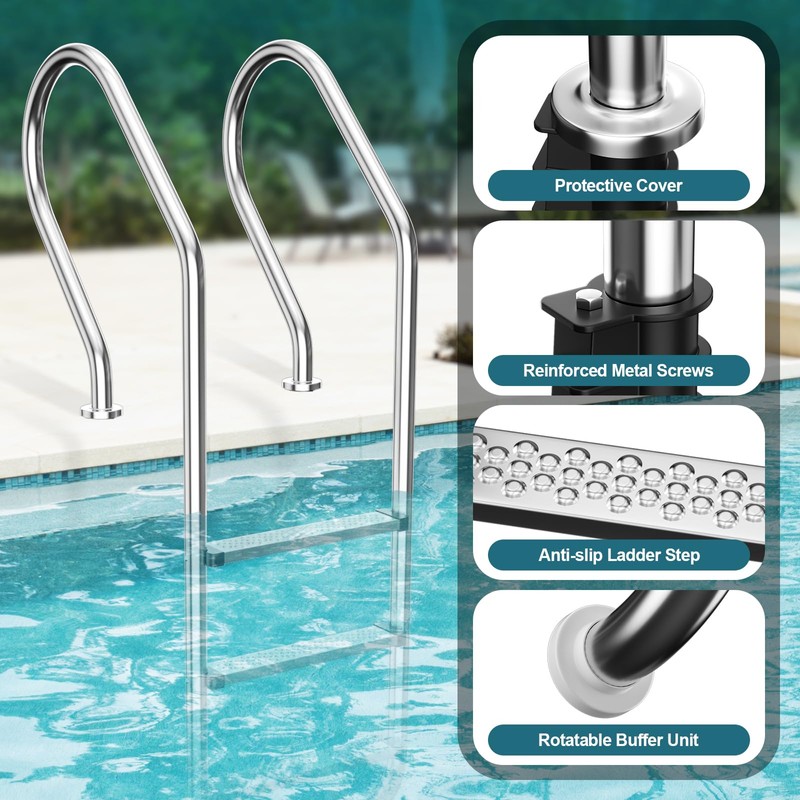 - INTELLIGENT SAFETY DESIGN: This ladder has three non-slip treads and each step is designed with non-slip rubber pads, which can increase the friction and prevent you from slipping when entering and exiting the pool. Makes it easier and safer for you to get in and out of the pool. The ladder handrails are ergonomically designed to give you an easier and better grip on the handrails. The clever and safe design ensures a comfortable and safe swimming experience.
