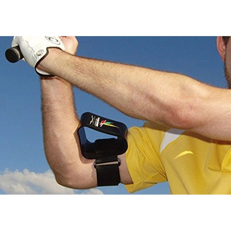 Swing Extender Golf Swing Trainer. The Swing Extender prohibits collapsing of the arms while encouraging a better shoulder turn. It's the hardest move to master and feels completely unnatural to most amateurs, but once it's learned, the rewards are most satisfying. Increased distance, accuracy and lower scores are a direct result of the maximum clubhead acceleration you create with your wider arc and fully extended arms. The instant you strap it on your arm and take a swing, you'll hit the golf ball longer, straighter and with more control. That's because the Swing Extender creates the proper extension of your arms during the backswing by preventing the arms from overfolding and then promotes the correct release of the arms and hands during the downswing. This 90 degree "power angle" formed at the top of your backswing allows you to create a wider swing arc by keeping your left arm straight (right arm for left-handers). The Swing Extender instantly corrects the most common flaw in golf.