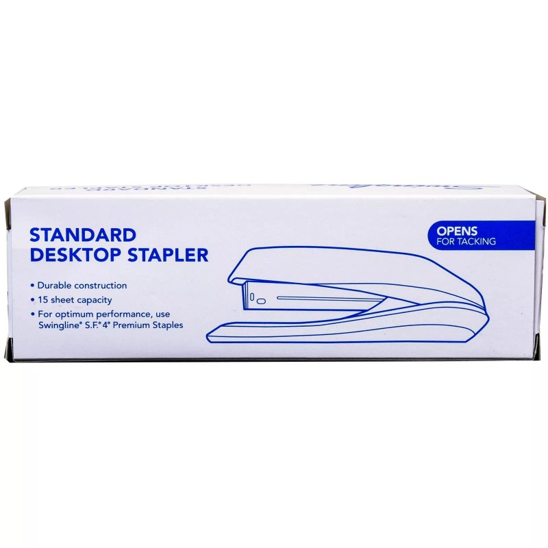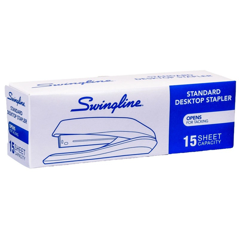 Swingline 54501 Standard Desktop Stapler, Black. Perfect for regular stapling at work, home or school, this standard stapler fastens up to 15 sheets. It is eco-friendly with a top cap that is made from no less than 50 percent recycled material. Stapler opens for tacking ability. Rotating anvil (the metal plate at the base of the stapler) allows you to create a temporary pin staple. Stapler is protected with an antimicrobial application that helps preserve the integrity of the product by preventing bacteria and mold growth. Full rubber base prevents skidding during desktop use. Takes full strips of standard staples. For best results use Swingline A3A35450 staples.