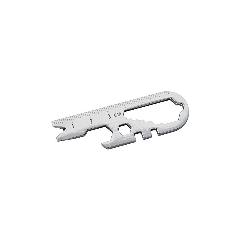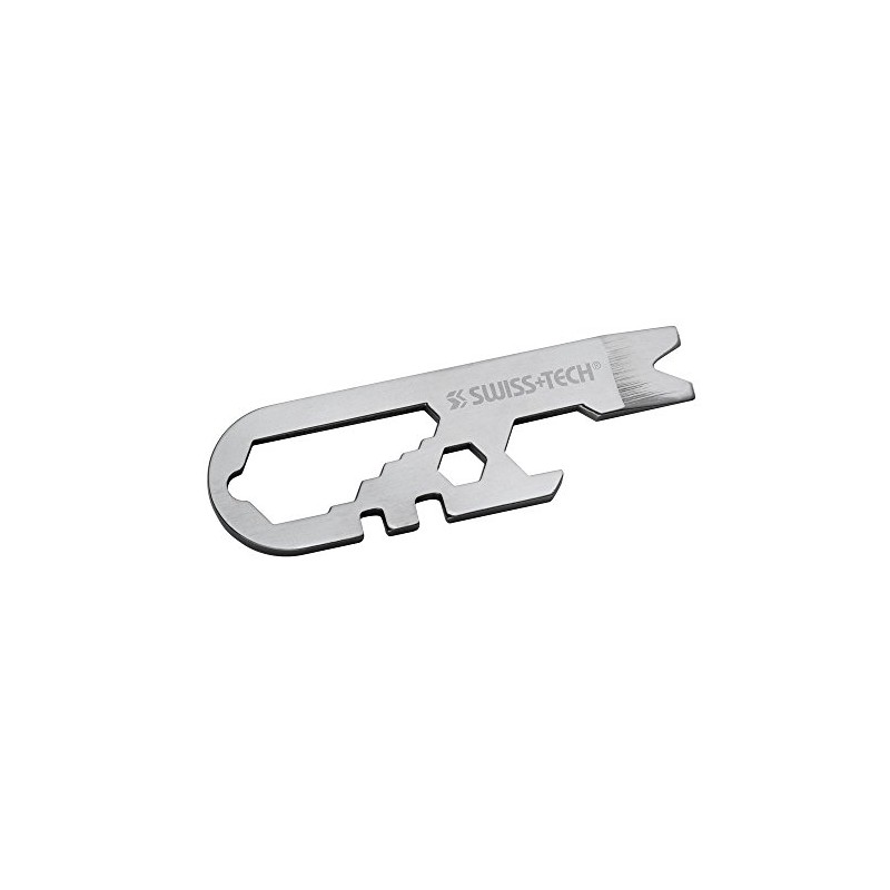 The SWISS+TECH Micro-Slim Flat wrench is a slim micro-tool with a variety of functions for on-the-go repairs and outdoor activities. This precision-crafted tool is heavy duty yet compact for easily attaching to a key ring or carabiner. It features 10 wrench sizes, including 5.5mm, 7mm, 8mm, 10mm, 13mm, 14mm, 1/4 inch wrench and hex driver, 3/8 inch wrench and two spoke wrenches. A nail Puller or pry bar, metric ruler and flathead screwdriver are great for small repairs or projects. This Micro-Slim tool also includes a fingernail cleaner and bottle opener.