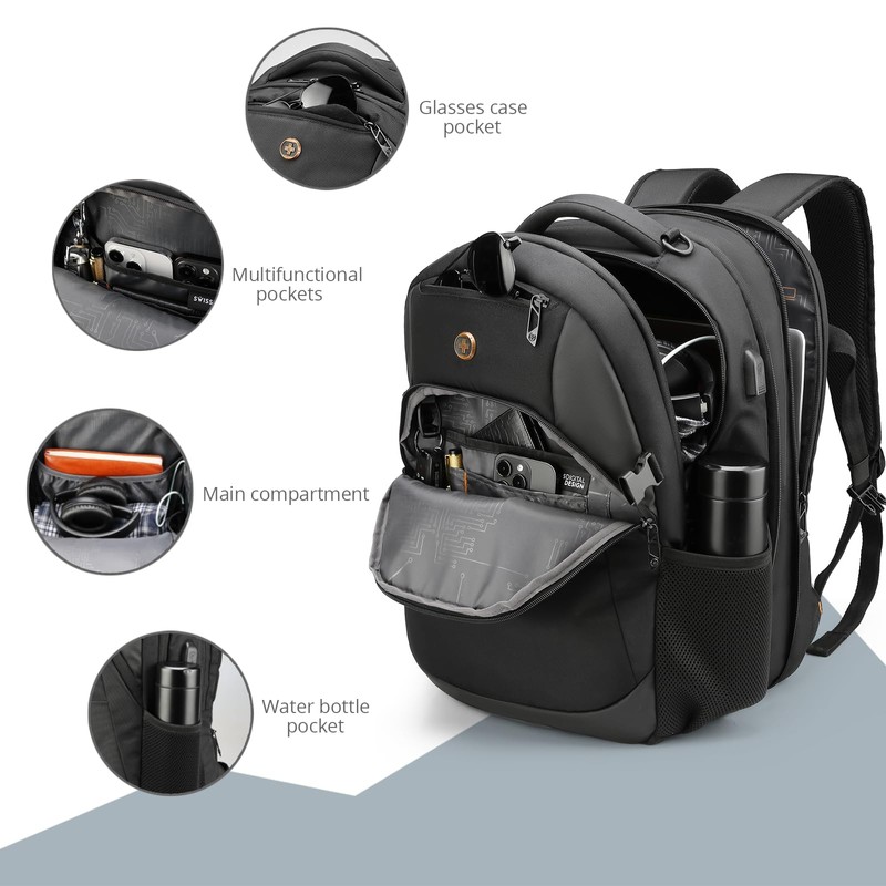 Swissdigital Design Travel Laptop Backpack, College Laptops Backpack with USB Charging Port for Men and Women Fits 17 Inch Notebook, Black | ANDWIL