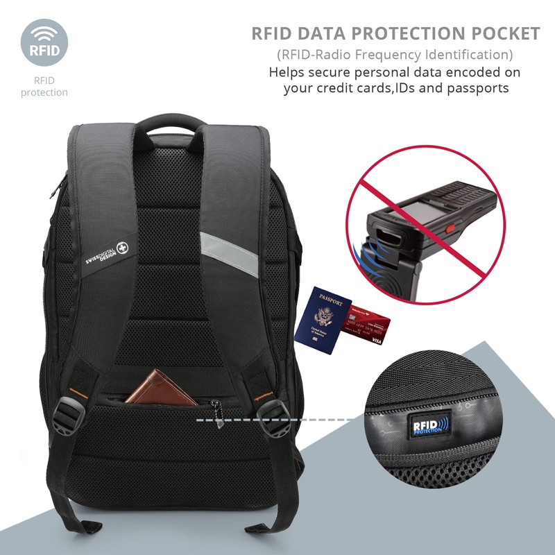- RFID DATA PROTECTION: Travel with peace of mind. Work backpack for men with an integrated RFID protection compartment, helps to protect your sensitive personal data (such as credit cards, passports, and driver's licenses) from being accessed by scanners.