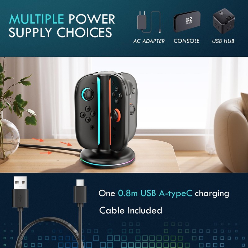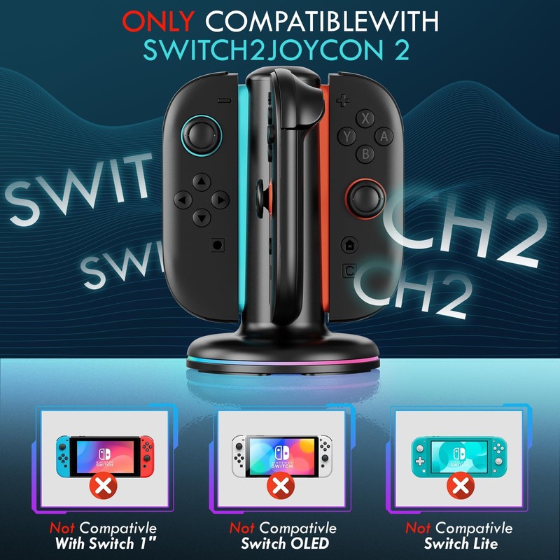 - 【Charging Solution for Switch 2 Joy-Cons】 This meticulously crafted switch 2 joycon charging dock is tailor-made for Switch 2 Joy-Con controllers, enabling you to charge up to four Joy-Cons at once. Say goodbye to unexpected battery drains during intense gaming sessions; with this switch 2 joycon charger, you'll always have fully powered controllers at your fingertips, ensuring uninterrupted gameplay.